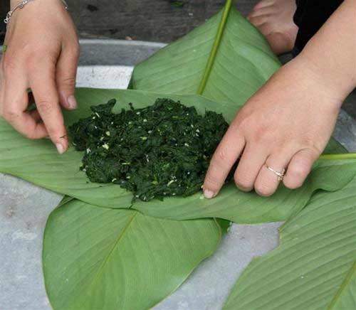 Pour les Thais noirs dans la province de Dien Bien, les mousses sont un plat uniquement réservé aux convives de marque. On a donc des mousses grillées ou frites. Mais il faut reconnaître que ce sont les mousses mêlées avec du gras et des ingrédients du terroir emballées dans des feuilles de phrynium qui sont les plus délicieuses. Et les plus originales aussi, puisqu’elles sont cuites dans des cendres brûlantes puis au charbon jusqu’à ce que les feuilles de phrynium soient complètement calcinées, que le gras et le liquide vert parfumé typique des mousses de ruisseaux suintent. C’est à ce moment là qu’on extrait les mousses des cendres pour les mettre sur un plateau. Quand vous ouvrez l’emballage de phrynium, vos papilles devront alors faire face à une offensive irrésistible d’un mélange de plusieurs dizaines d’ingrédients. Mais les mousses, elles, restent d’un goût frais et incroyablement fin! Aux dires des Thais, c’est un plat qui aide à la circulation sanguine, à se désintoxiquer, à se rafraîchir et à lutter contre l’hypertension artérielle. Seul bémol: les mousses ne sont disponibles qu’à une seule saison. Lò Thị Lường: “On peut trouver les mousses en hiver seulement. Et c’est entre octobre et décembre qu’elles sont les plus délicieuses. Le reste du temps, elles sont vieilles, jaunes, en un mot pas consommables. Pour pouvoir manger des mousses tout au long de l’année, il faut les consommer séchées, mais c’est décidément moins bon que lorsqu’elles sont fraîches.”