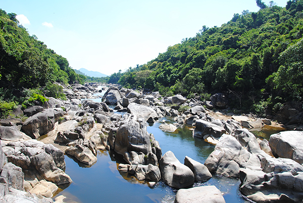 Ham Ho est doté d’un cadre paysager romantique, notamment un segment de rivière d’environ 3 km de long. Au lit de la rivière, se réunissent de grands blocs de granit à formes étranges. En particulier, à la rive gauche du segment rival, il y a une cascade nommée Ham Ho – le fruit du fléchissement brusque de la rivière. À la saison de pluie, les poissons remontent à contre-courant jusqu’à l’amont rival pour faire la reproduction et elles doivent franchir la cascade Ham Ho. La légende dit que chaque année, des centaines de poissons y vinrent au complet pour franchir la cascade et les vainqueurs transformèrent en dragons. Donc, la cascade est aussi connue sous les noms Ca Bay (Poissons prenant son envol) ou Vu Mon (porte des Cieux). Deux berges de la rivière sont teintes de la verdure des myrte tomenteux et barringtonia. Il s’agit le milieu vital de nombreuses espèces animales comme tourterelle tigrine, garrulax, zostérops, gecko…